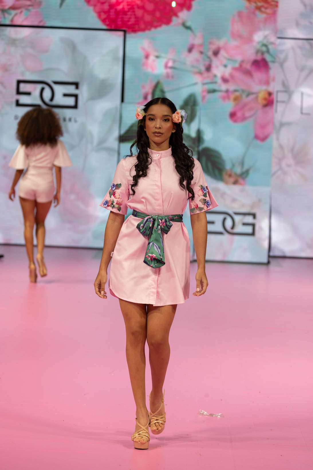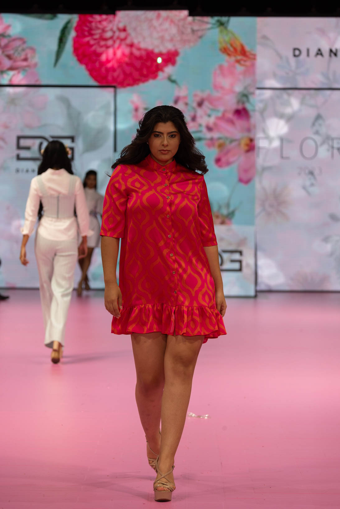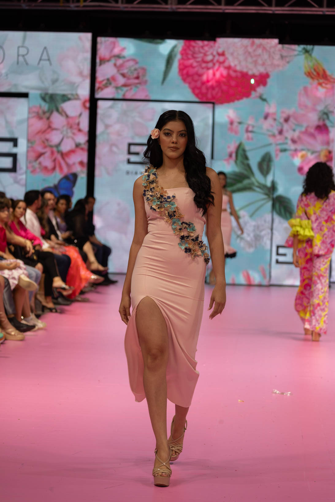 Intercalada con talento nicaragüense, las luces y lentes dieron la bienvenida a Diana Flores que llegó desde República Dominicana. “Viva la vida”, está conformada de atavíos estampados, floreados y delicados cuadros en tonos rosados, celestes, azul, amarillos y un despampanante rojo. Fueron las flores quienes la motivaron a crear, “las mujeres somos como las flores, somos delicadas, somos sutiles, pero a la vez somos imponentes y elegantes, con la naturalidad que tenemos provocamos que todo mundo quiera vernos y apreciarnos”.